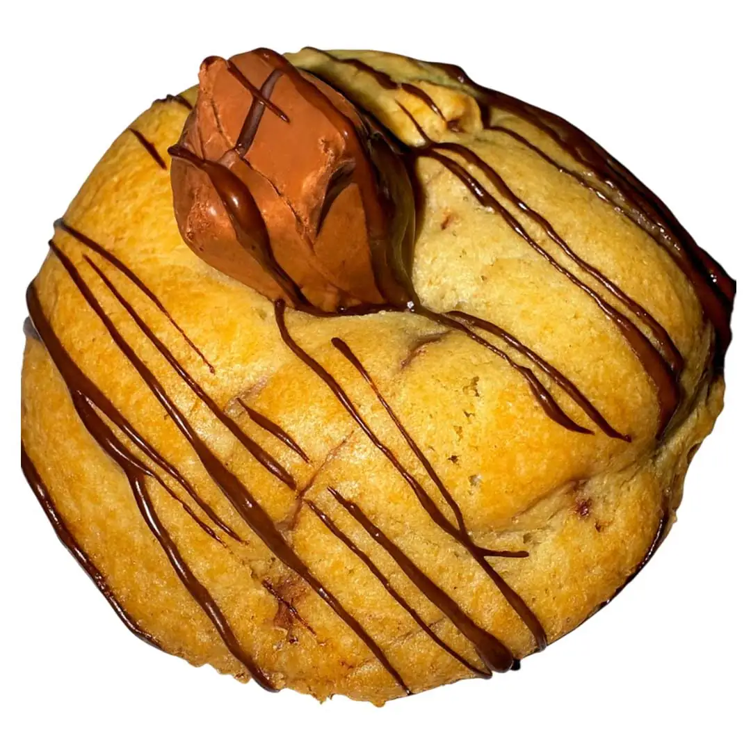 Cookie au Kinder Bueno , doré et moelleux, avec un cœur fondant et un morceau de Kinder Bueno sur le dessus pour une touche croustillante et gourmande.