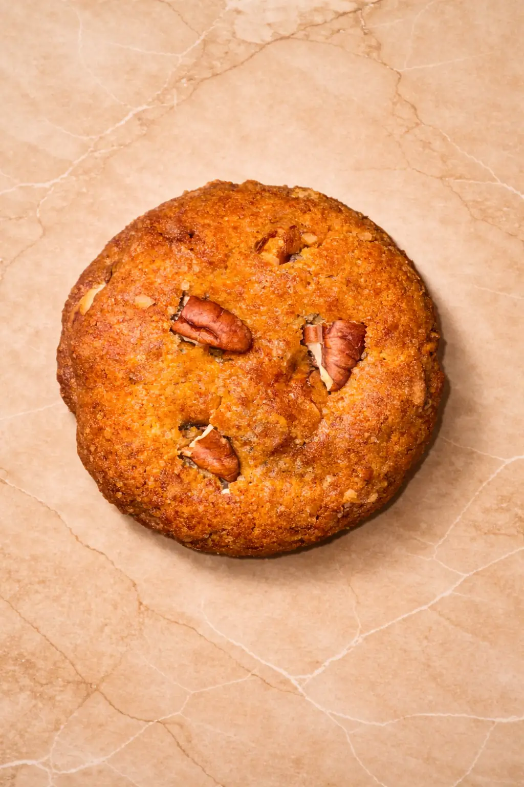 Cookie noisette, noix de pécan et miel, doré et moelleux, préparé avec de la pâte de noisette et du miel, puis parsemé de noix de pécan pour une touche croquante et gourmande.